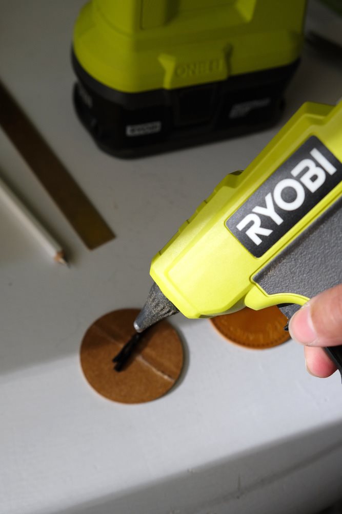 Użyj pistoletu do klejenia, aby przymocować sznurek z jednej strony (tej nie grawerowanej) skórzanego kółka.